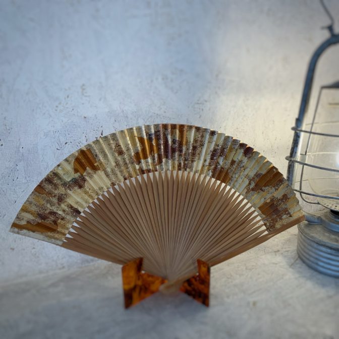箔の彩りを全面に出した素材の魅力が特徴で扇面の面積が広いと普段使いにはくどくなって飾りや舞の扇子になってしまうのですが、扇骨部分の面積が多いため箔の存在感がちょうど良く上品に仕上がっています。