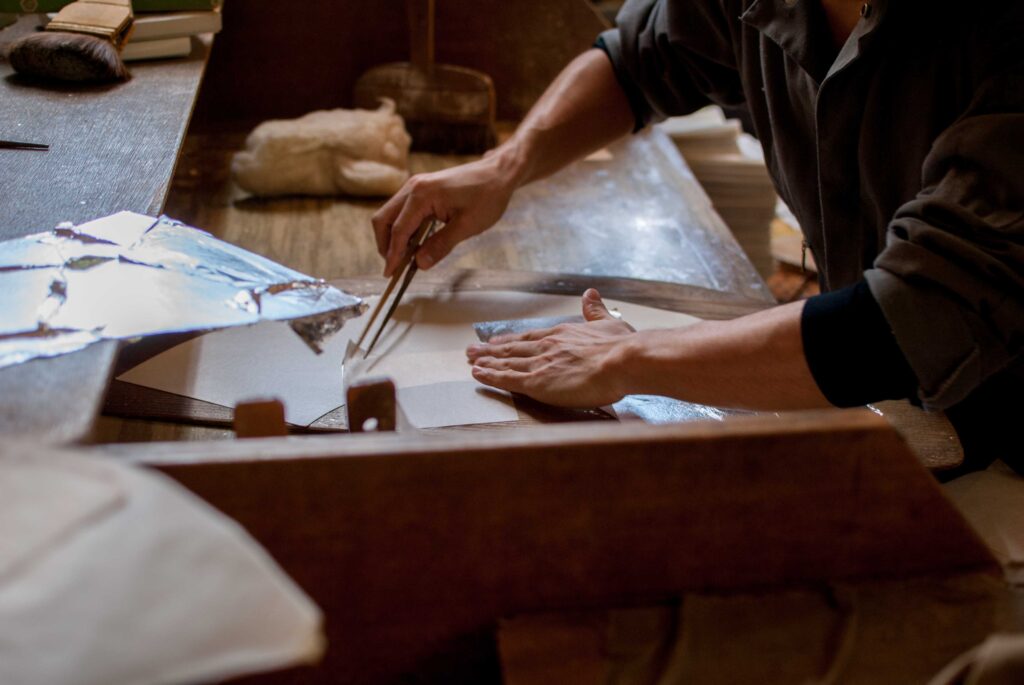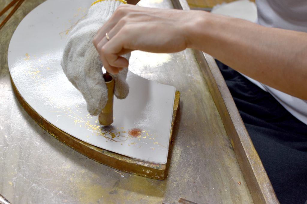技術的な特徴としては、砂子、野毛など蒔絵に使われる技術から無地で並べていく箔押しまで幅広い表現方法をもっていて、後に折りという工程を経ても剥がれないという点です。