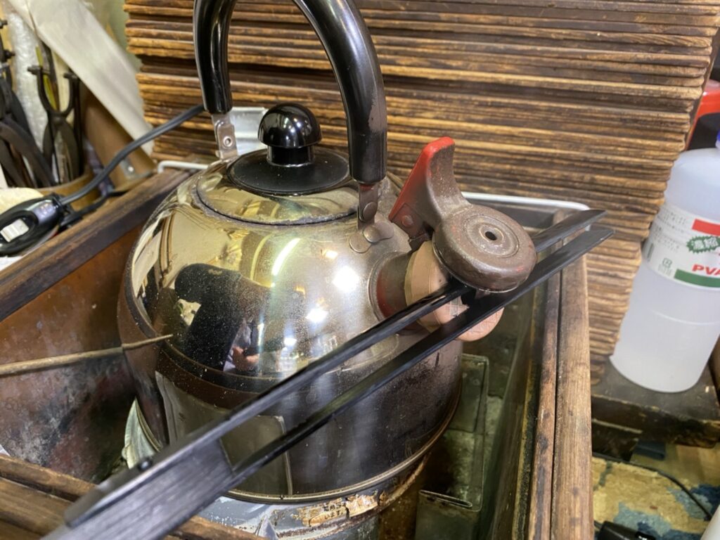 熱の加え方は職場それぞれで、写真のようにヤカンの蒸気を使う所もあれば、アイロンを使う場合もあり、電熱ストーブなどを使う所もあり、様々です。