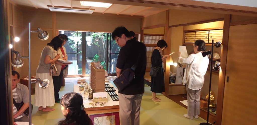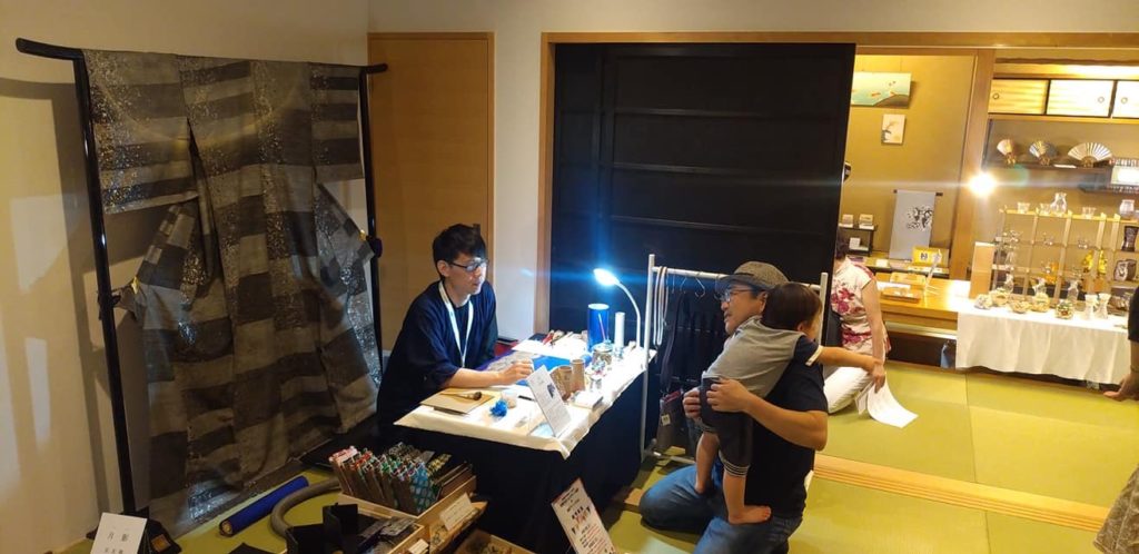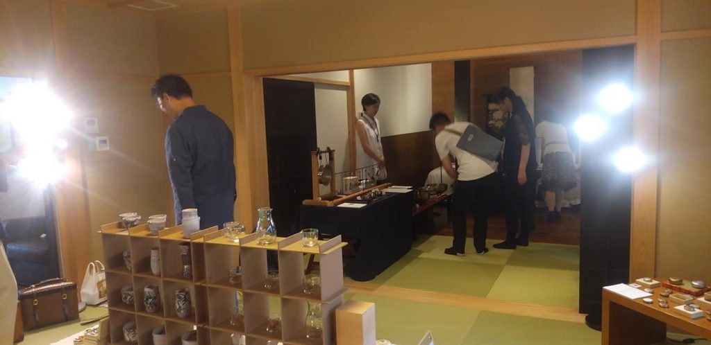 この展示会は、京都工芸美術作家協会、京都陶磁器組合連合会、ソマル、そして私たち京もの認定工芸士会 響による展示で、会場である京宿うさぎの部屋、お庭、お空、お山、お池の全室デラックスルームをそれぞれの世界観で表現する形になっていました。