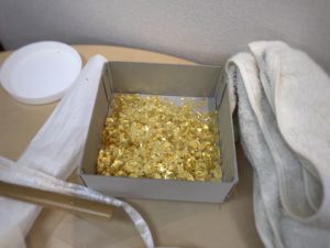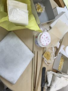 着色箔は金箔や銀箔に比べると分厚く少し勝手が違うのですが、同じやり方で切ることができるので、この後仕事で必要になりそうな分をこの機に作っていました。