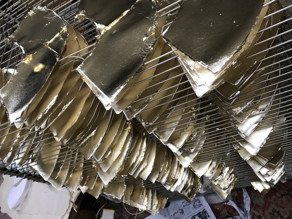 中金箔という銀を硫黄を使って金色に焼いた箔を使うことで、金色ながらギラギラ感を抑えた上品さが出て、箔を並べた跡の「箔あし」が伝統技法のアイデンティティを付け加えます。