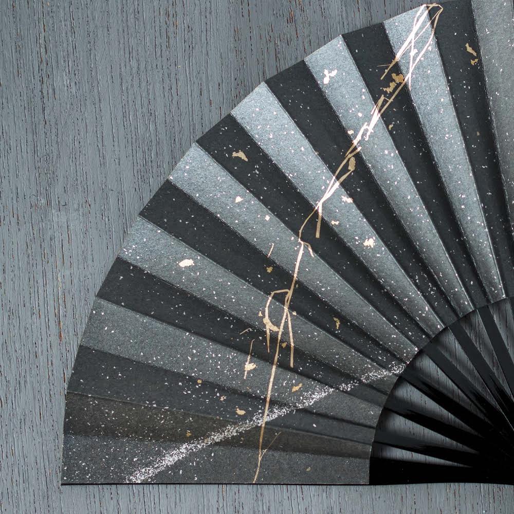 竹でできた扇骨、和紙に加飾を施した扇面。独特の形状の折り目をつけ、骨と紙を一つのものとする。