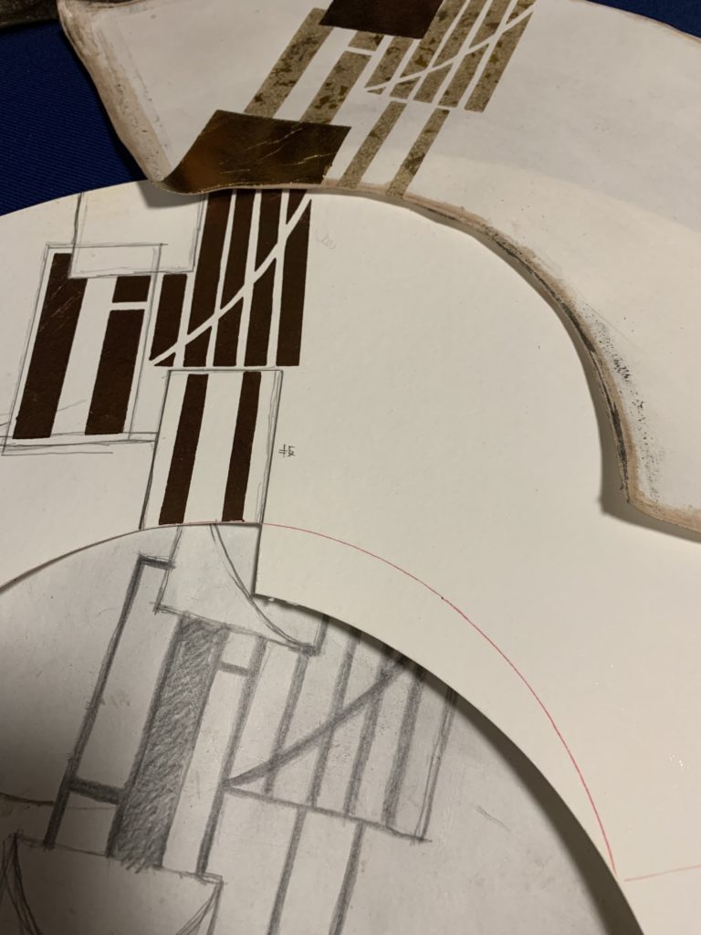 草案の段階から箔の素材感を組み合わせることはある程度頭の中で出来るのですが、少し複雑になってくるとやってみないとどのように仕上がるか把握しきれないので段階的に箔を使いながら修正していきます。