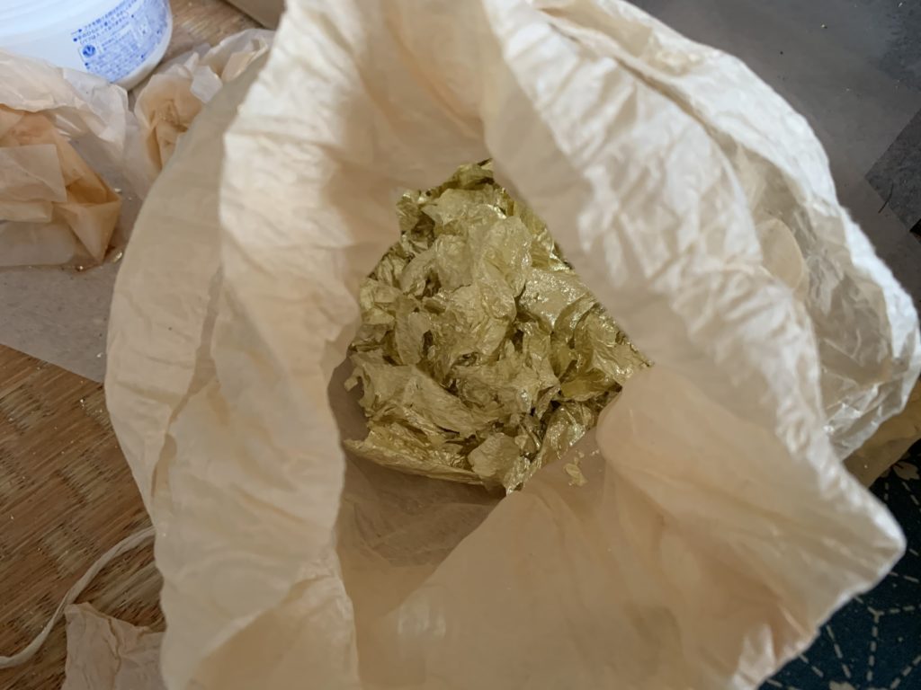 砂子は箔押しに使った箔の切れ端、もしくは切り回しといううち伸ばした箔を規程の大きさに切った後の切れ端を使います。