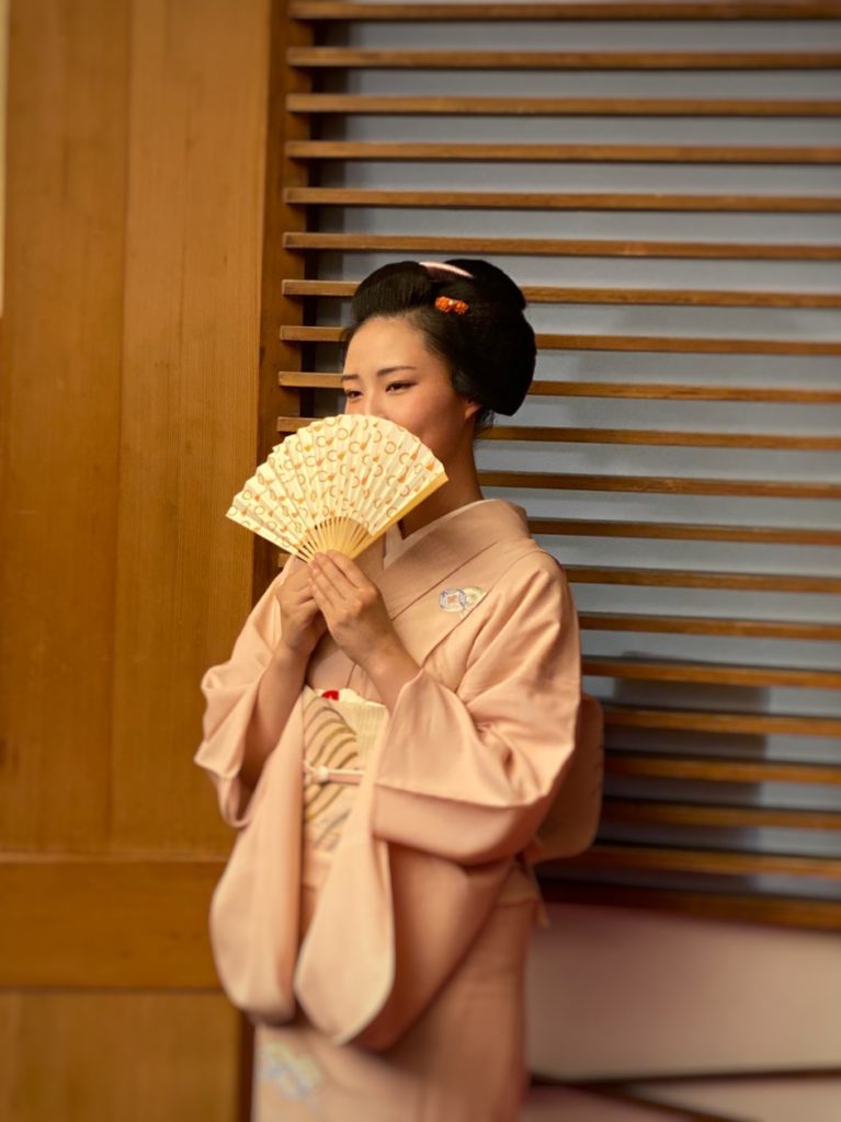 芸、舞妓さんの場合、花街や座敷の雰囲気やメイクの関係でなかなかマスクをすることもできないので、この口元を隠すという仕草と飛沫対策を座敷や花街で実践して頂ければと考えております。