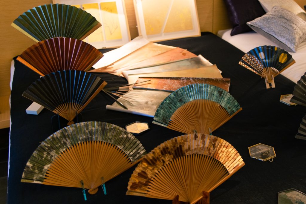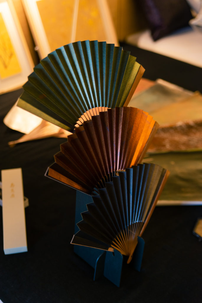 時間をかけて出来る素材、焼箔そのものを京扇子の持つアイデンティティに重ねた表現の「燻」も同じ三色展開、税抜き8500円。