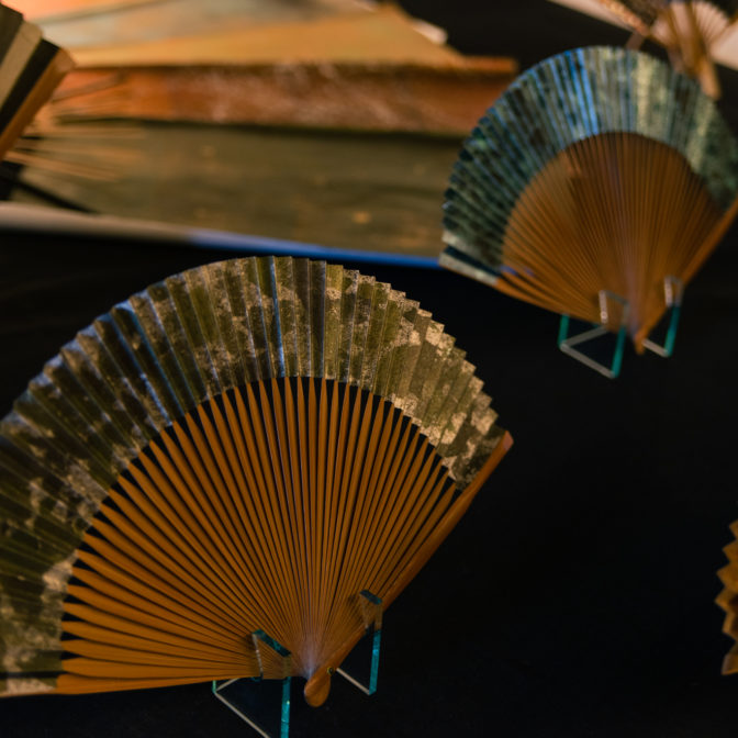 また古くから能や茶道などの芸事、神事、祭事、仏事とともに、日本人の美徳や祈りを表現してきた京都の扇面加工技術を用いることでそれらが伝えるエモーショナルな華やかさの中の儚さやもののあはれなどの感覚を可視化しています。
