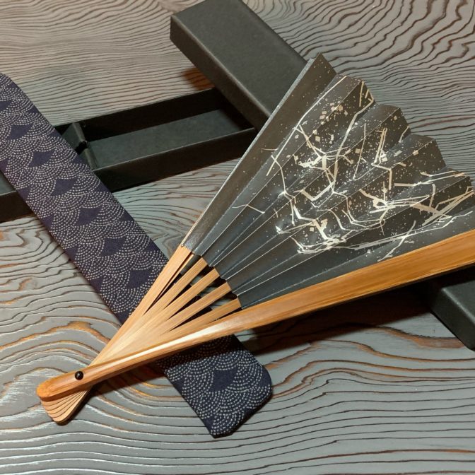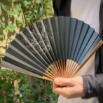 黒い扇面に銀の輝きが映え、焼煤竹の扇骨と合わさり、日本の扇子らしい高級感を持ったデザインとなっております。