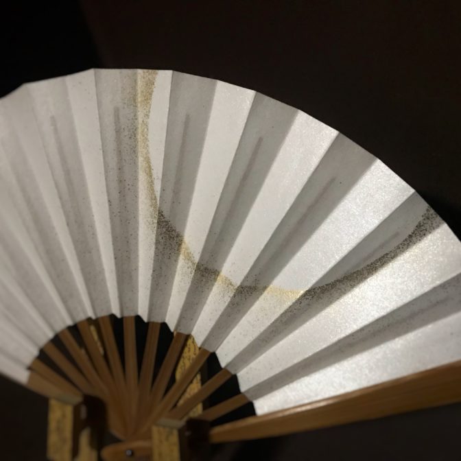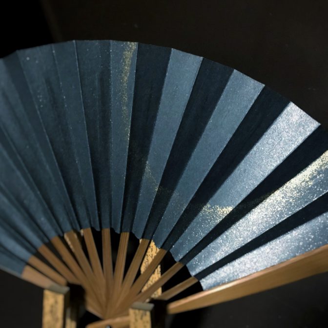 決して完成する事のない、人をもてなす心の真理の道半ばの精神を京扇子らしく落ち着いた色合いの箔を使って表現しました。